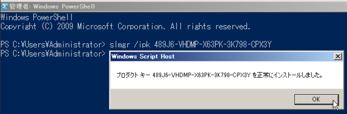 slmgr /ipk [Client setup Key] を入力します。 ※[Client Set Up Key]は、4.4.4 Client Set Up Key 一覧を確認ください。