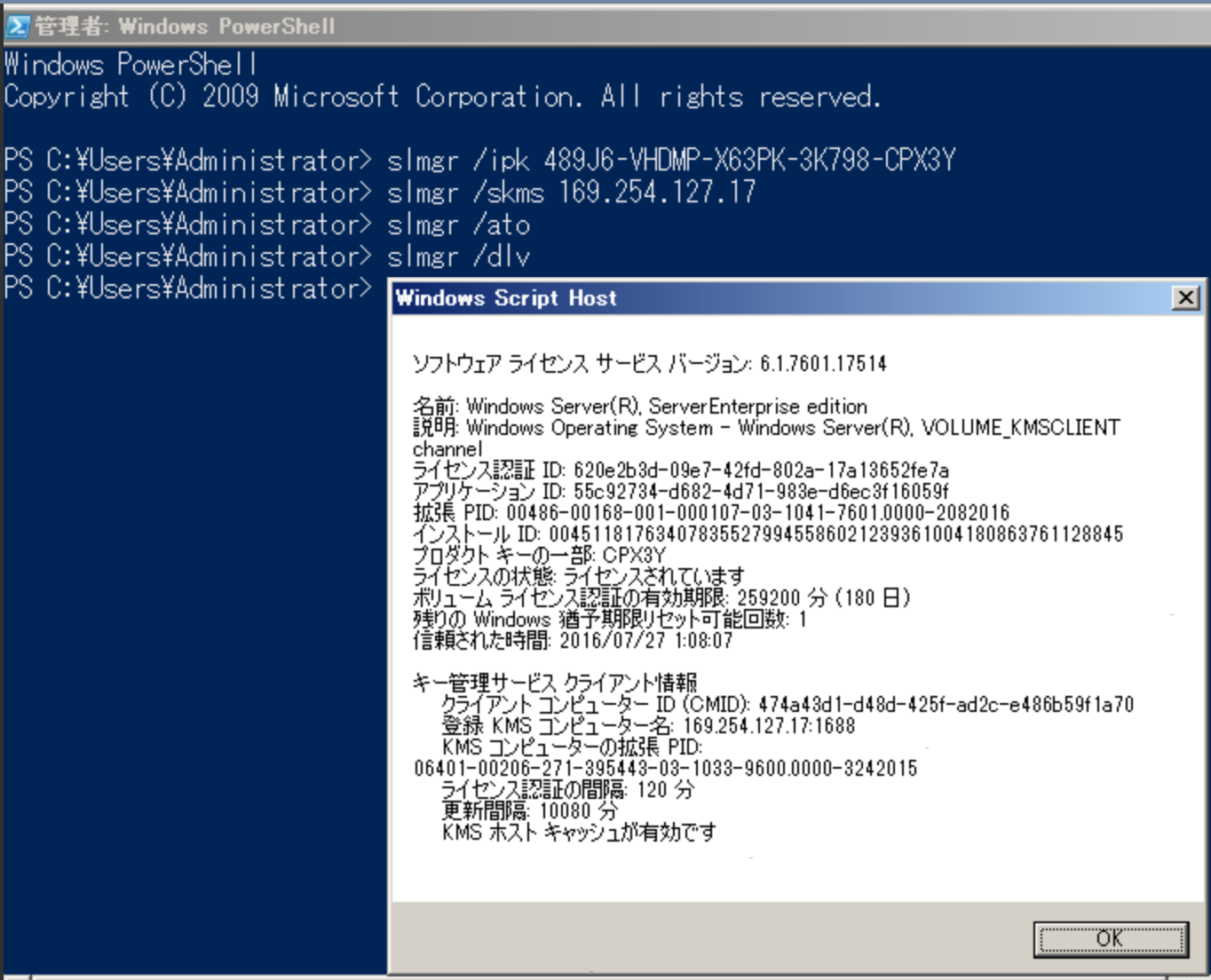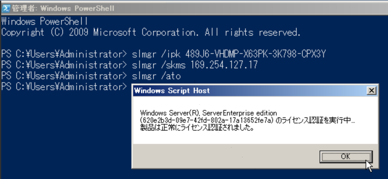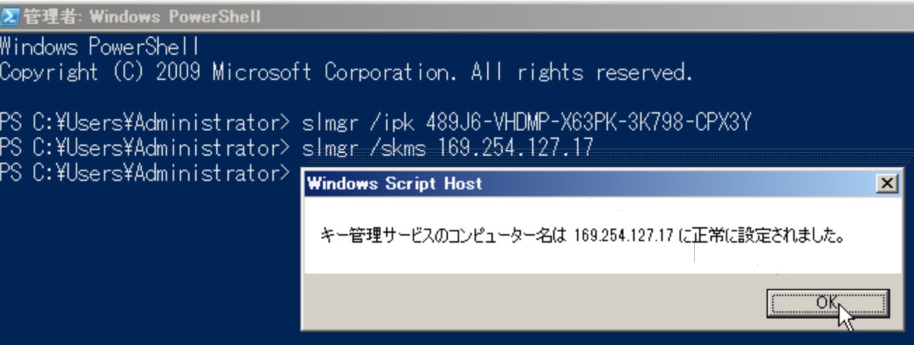 slmgr /skms 169.254.127.17 を入力します。