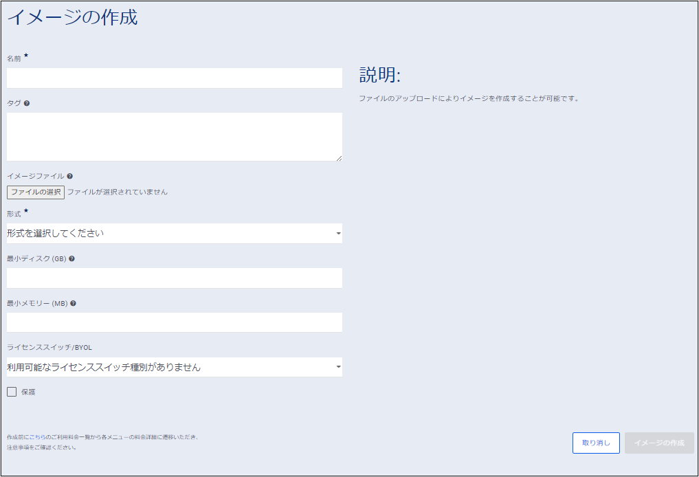 「イメージの作成」画面において、持ち込みを実施するイメージファイルを登録・アップロードを実施します。
