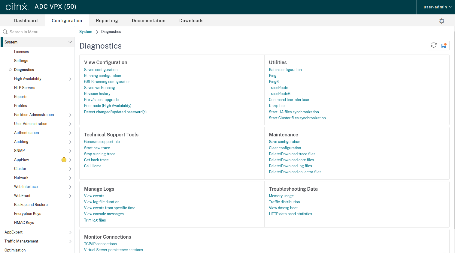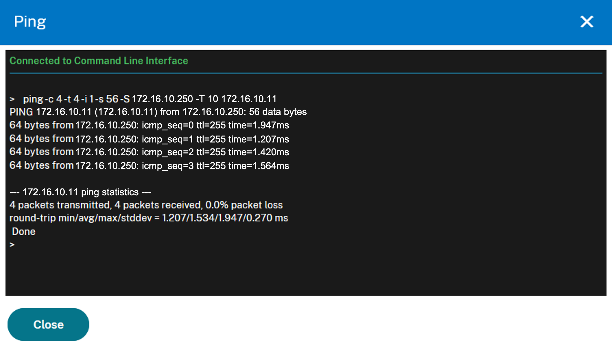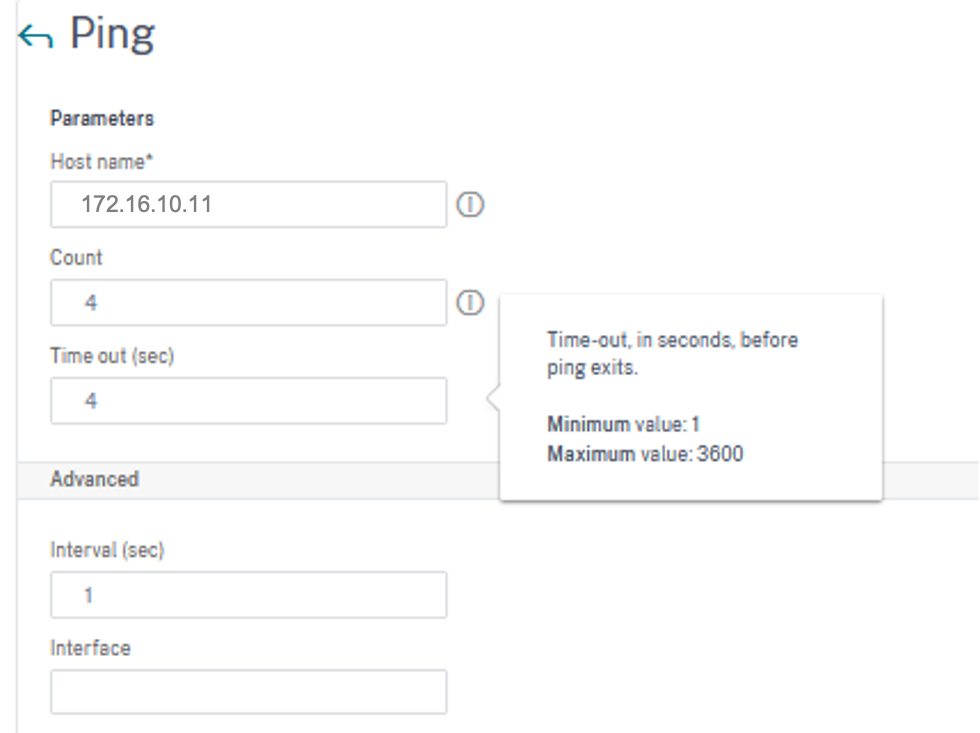 Citrix社より、GUIからPingを実行する際に、Countオプション「5」以上の値を入力した場合、結果が表示されないという不具合が存在することを報告されておりますので、Countオプション「4」以下の値を入力の上、Pingを実行いただきますようお願いいたします。「5」以上を選択されたい場合はCLIでPingを実行いただきますようお願いいたします。CLIへのアクセスについては、NetScaler VPX CLIへのアクセス方法(SSH) をご確認ください。
