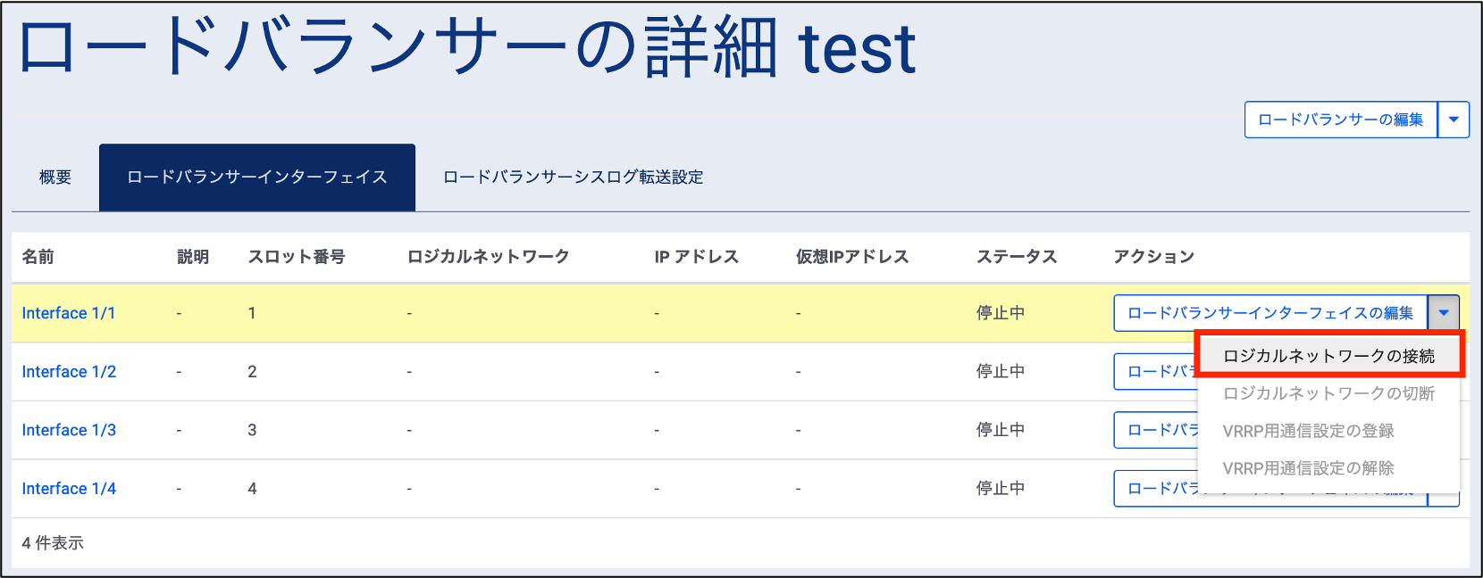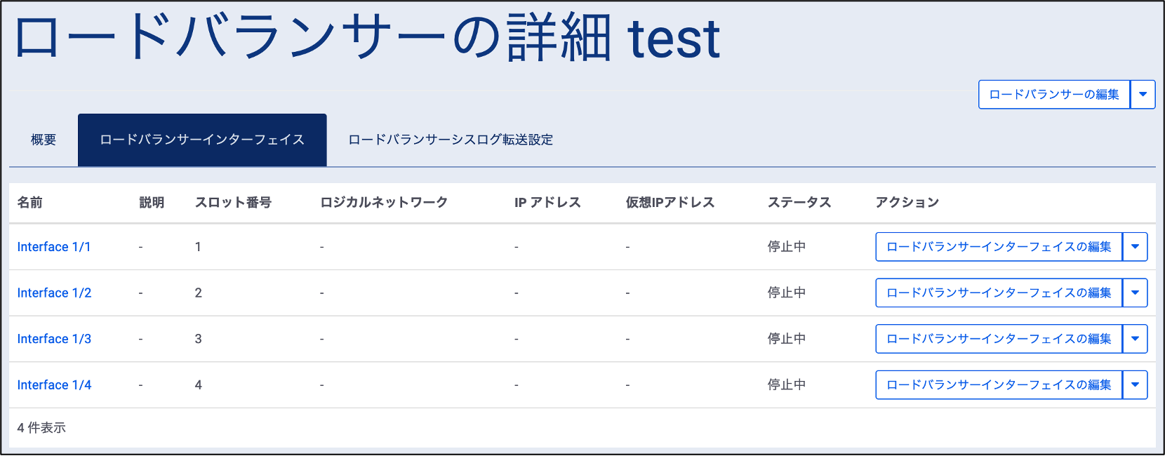 ここでは、ロードバランサーのプランを2Core-4interfaceで作成したため、ロードバランサーに接続可能な4つのインターフェイスが表示されます。