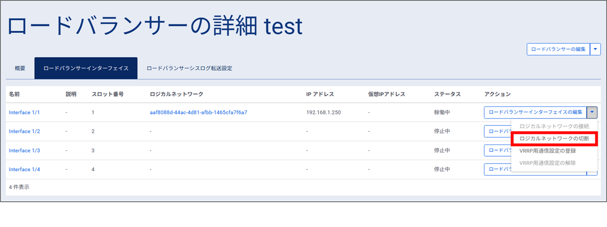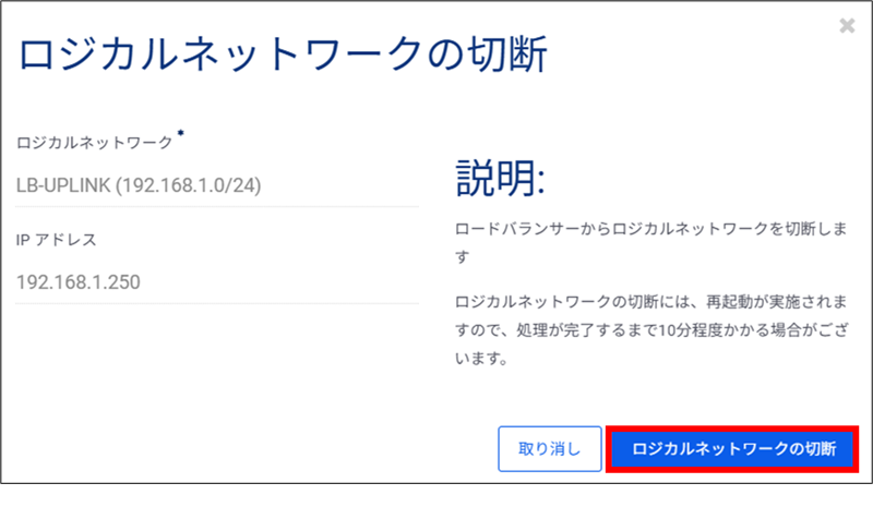 ロードバランサーインスタンスからロジカルネットワークを切断する場合は、「ロジカルネットワークの切断」を選択します。