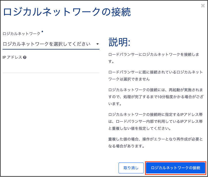 ロジカルネットワークの接続および切断においては、ロードバランサーインスタンスの再起動が実行されます。