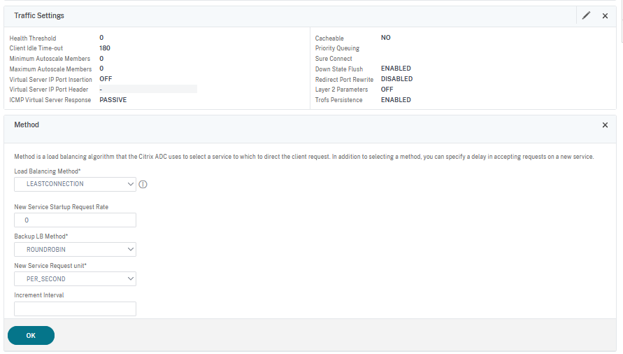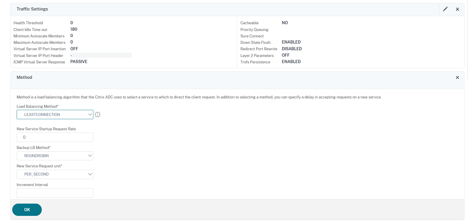 Methodの編集画面にて「Load Balancing Method」から「LEASTCONNECTION」を選択し、「OK」をクリックします。