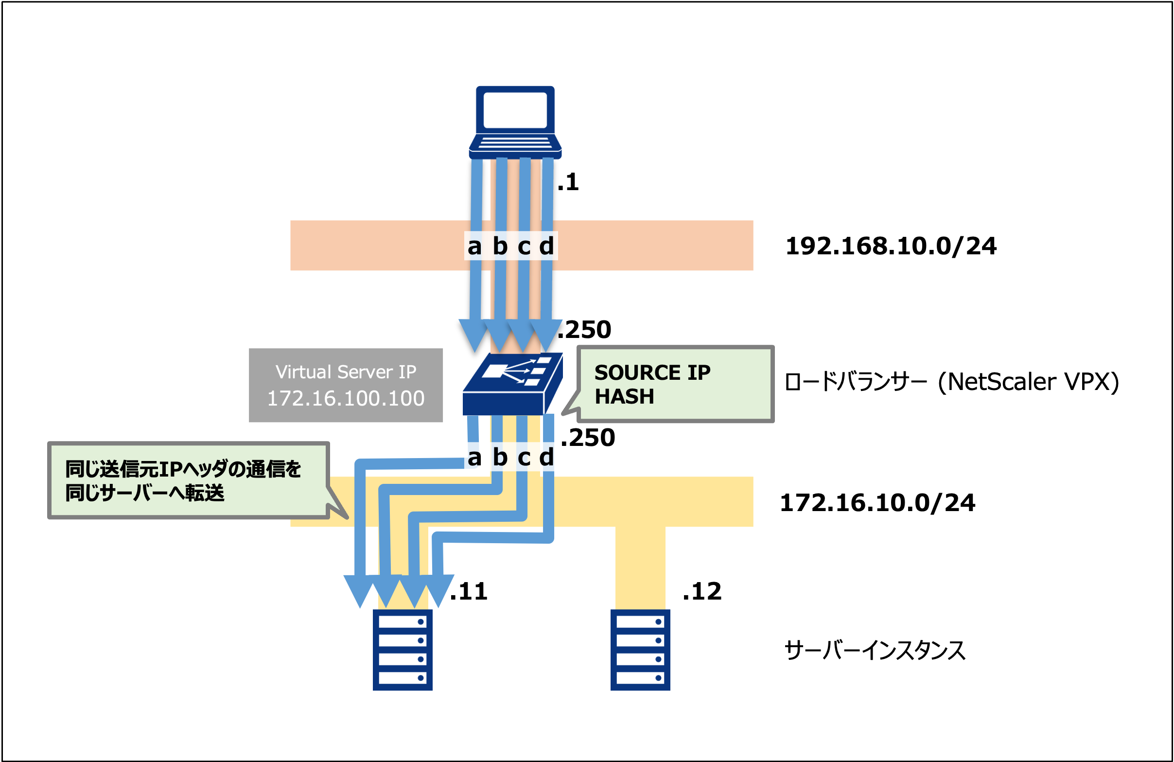SOURCE IP HASHは、クライアントからの送信元IPヘッダのハッシュ値に基づきサーバーに転送される振り分け方式です。