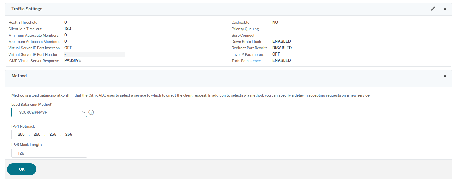 Methodの編集画面にて「Load Balancing Method」から「SOURCEIPHASH」を選択し、「OK」をクリックします。