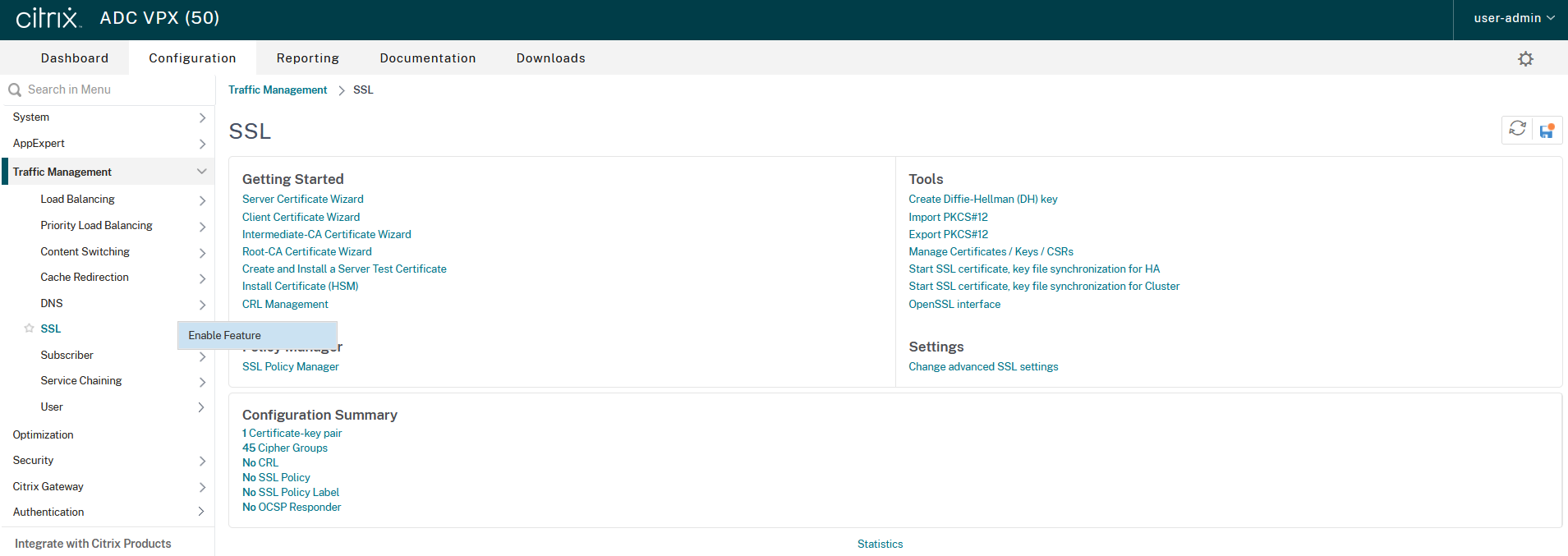 「Configuration」メニューから「TrafficManagement」→「SSL」タブのクエスチョンマークもしくはエクスクラメーションマークを右クリックし、「Enable feature」をクリックします。
