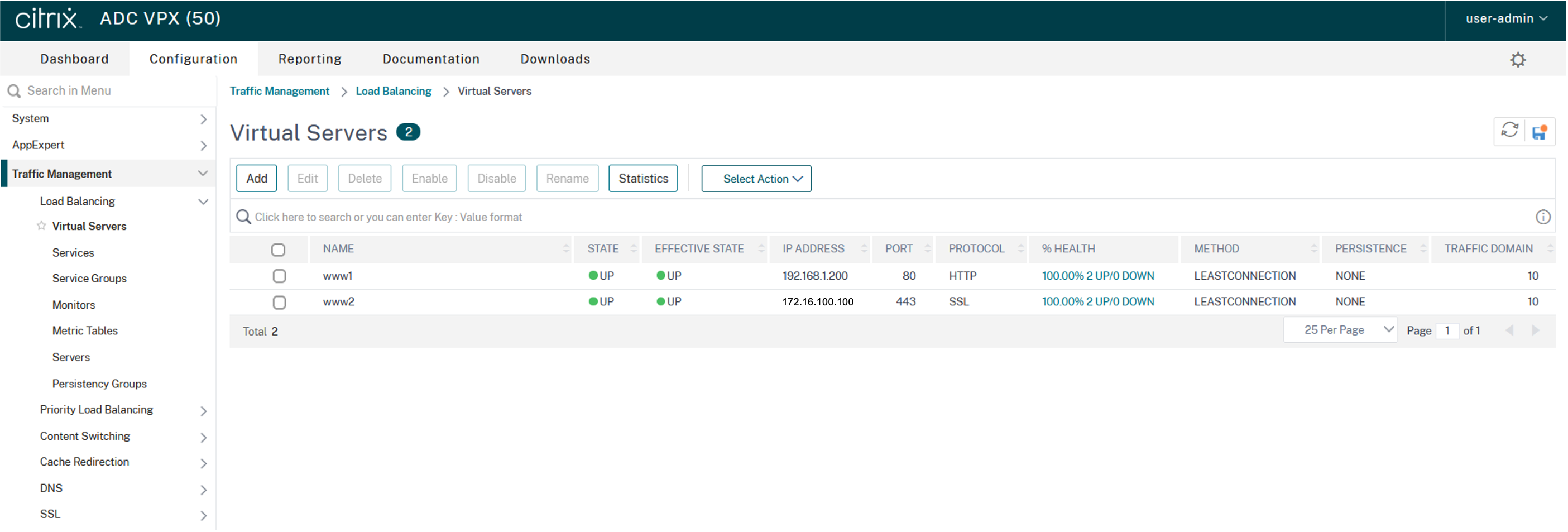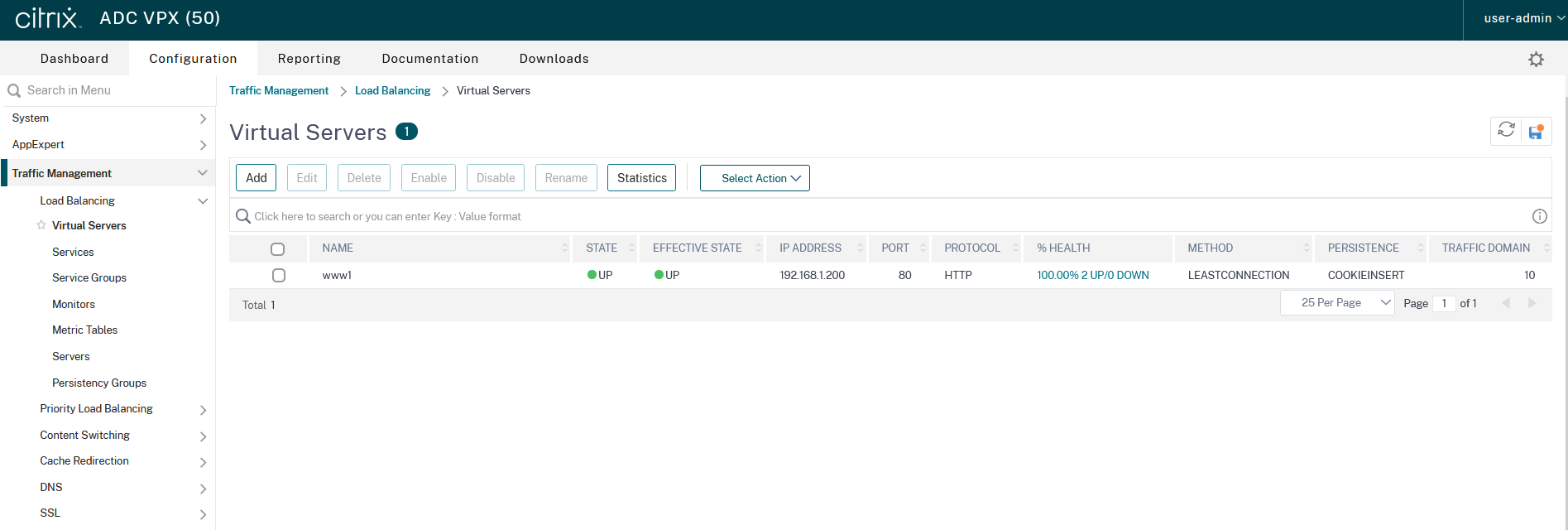 「Configuration」メニューから「TrafficManagement」→「Load Balancing」→「Virtual Servers」へと進み、Virtual Servers画面を表示後、「Add」をクリックします。