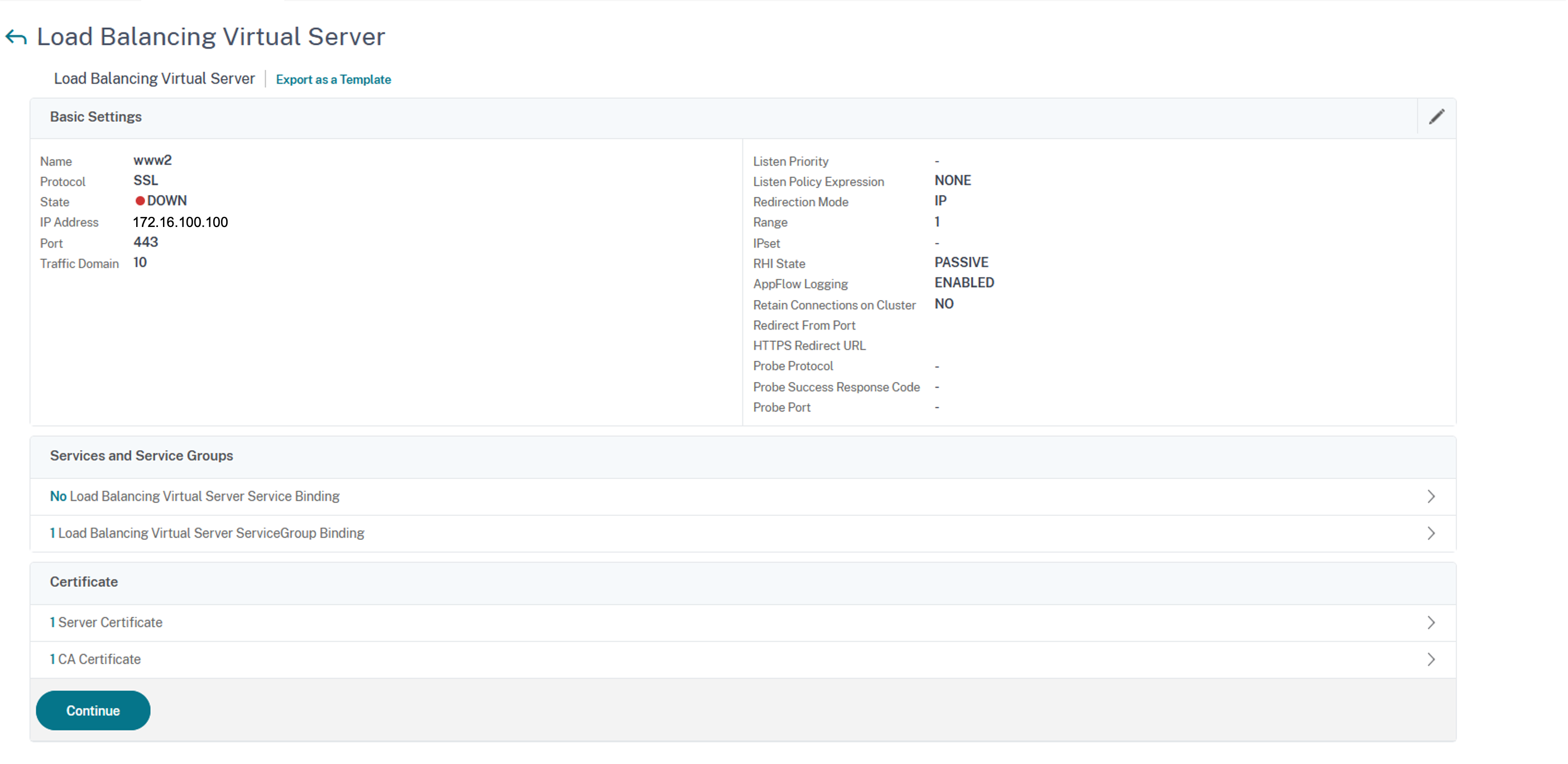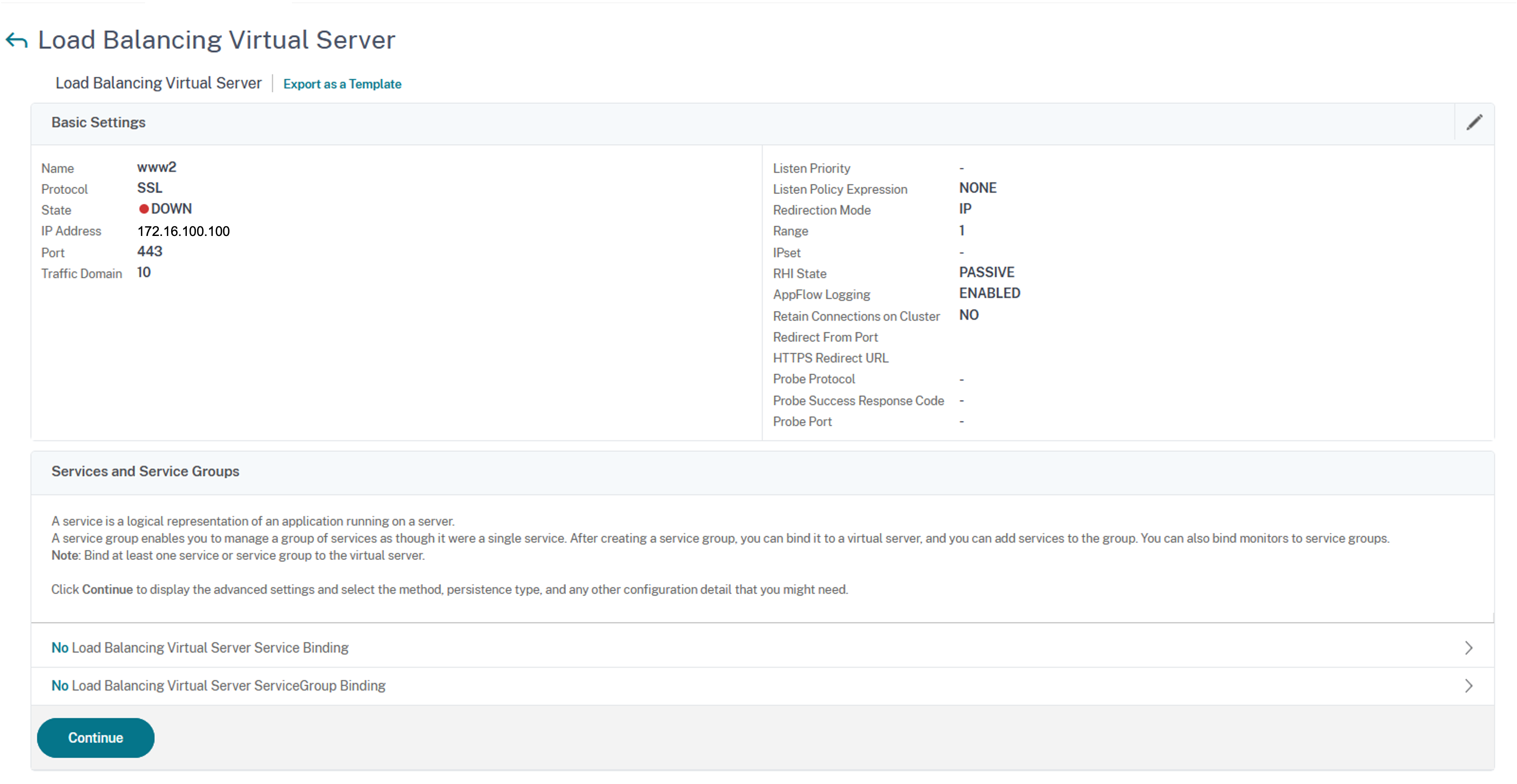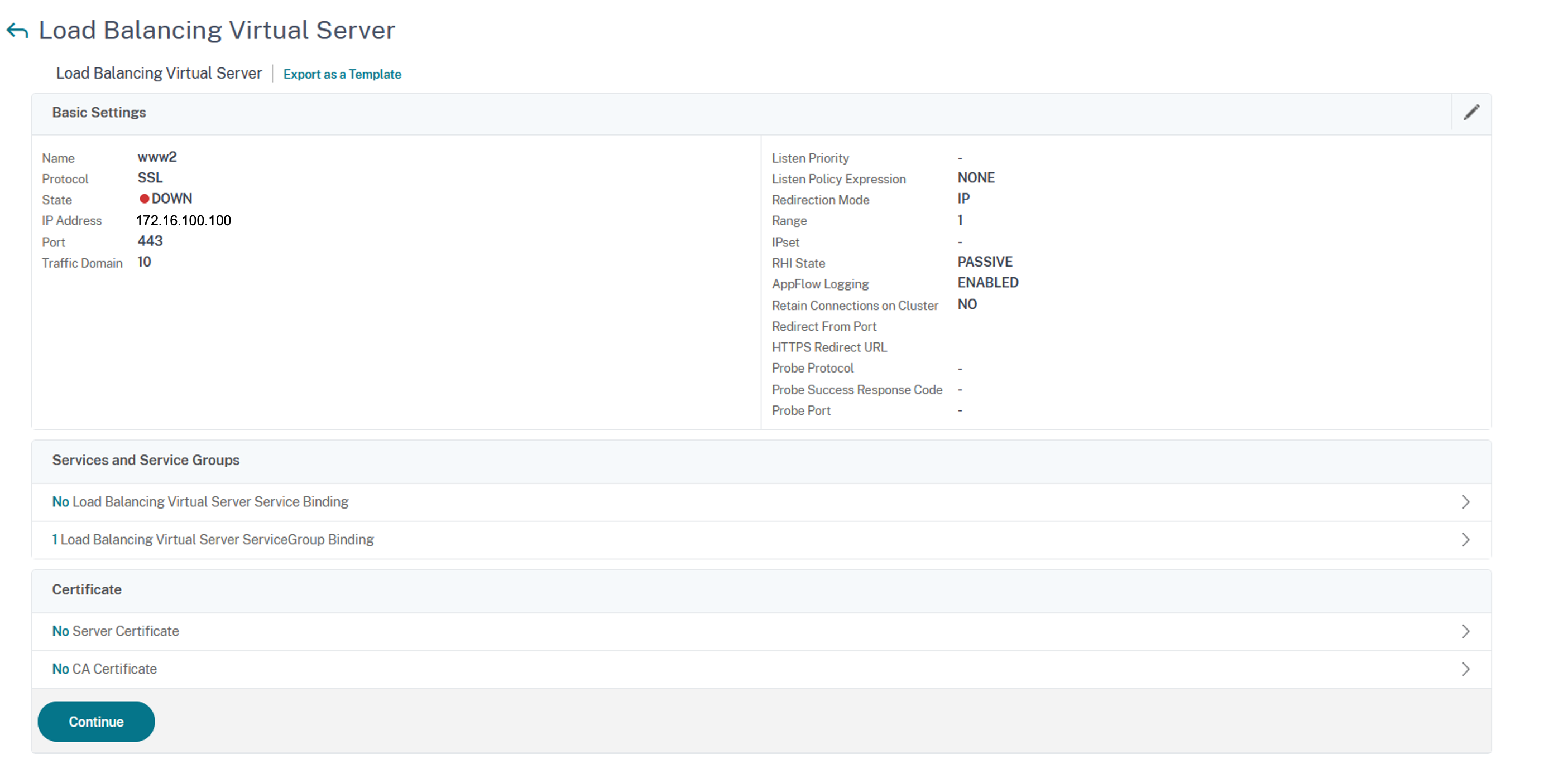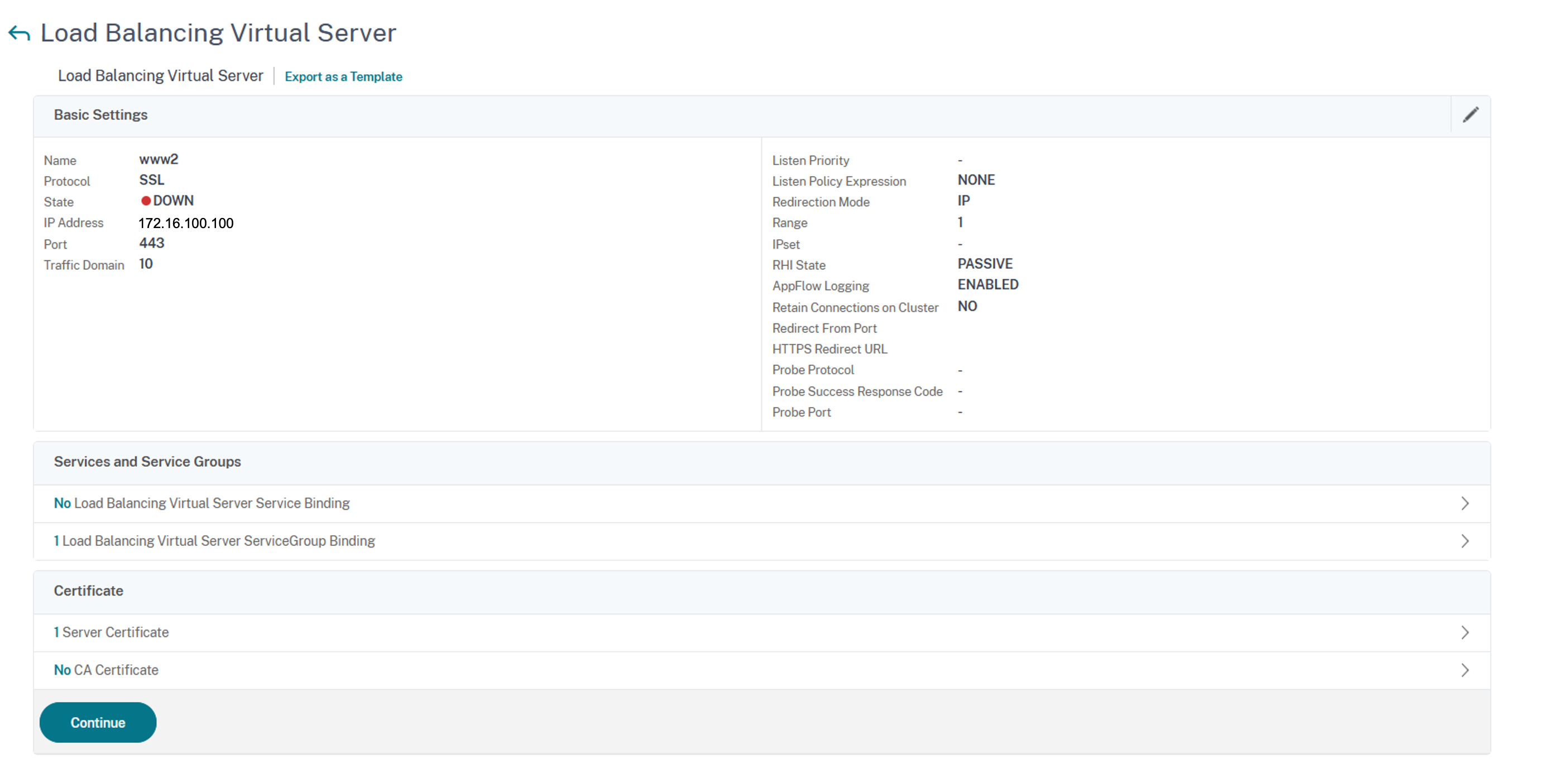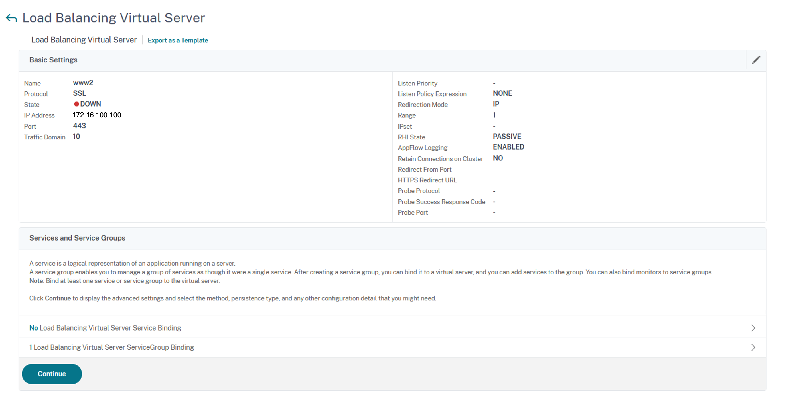 Virtual Serverの詳細表示画面が表示されるので、「Services and Service Groups」が「1 Load Balancing Virtual Server ServiceGroup Binding」と表示されているのを確認し、「Continue」をクリックします。