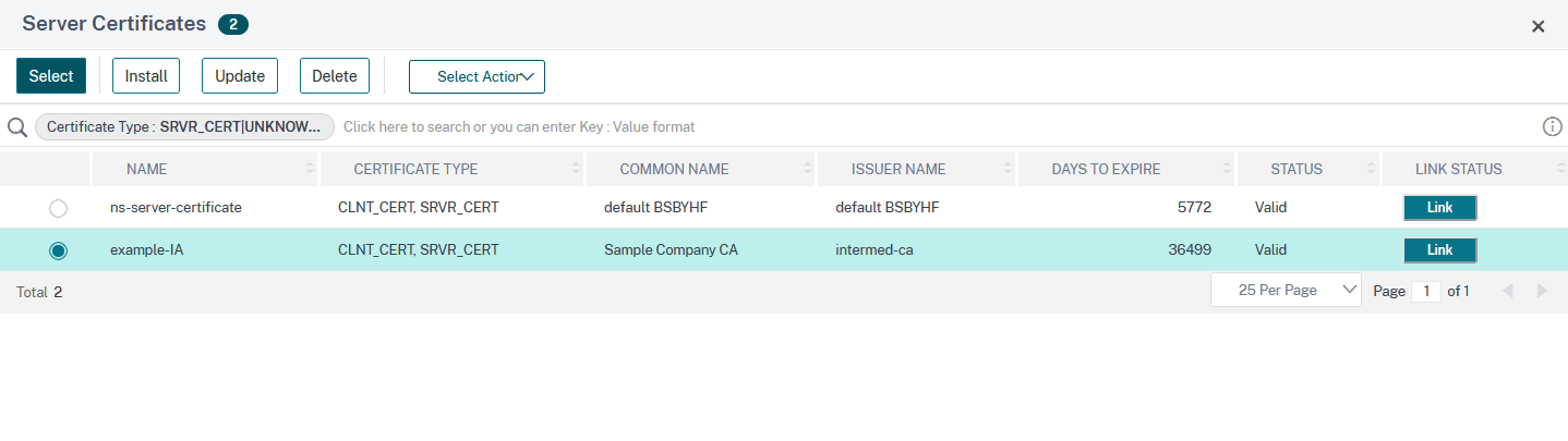 SSL Certificates画面で「example-IA」 を選択し、「Select」をクリックします。