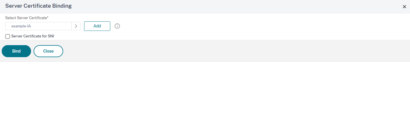 Server Certificate Binding画面が表示されるので、「Select Server Certificate」に「example-IA」が入力されているのを確認し、「Bind」をクリックします。