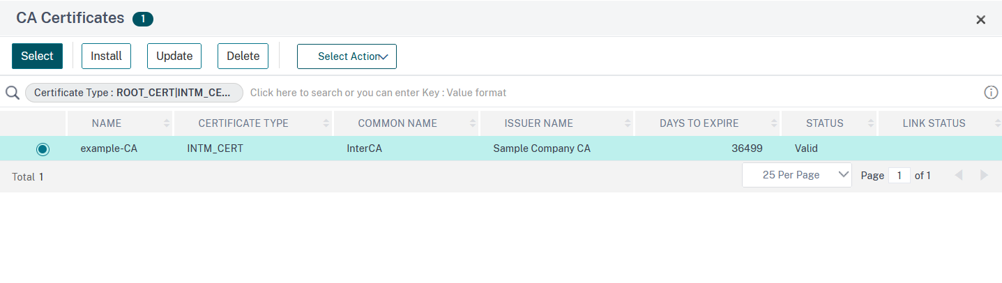SSL Certificates画面で「example-CA」 を選択し、「Select」をクリックします。