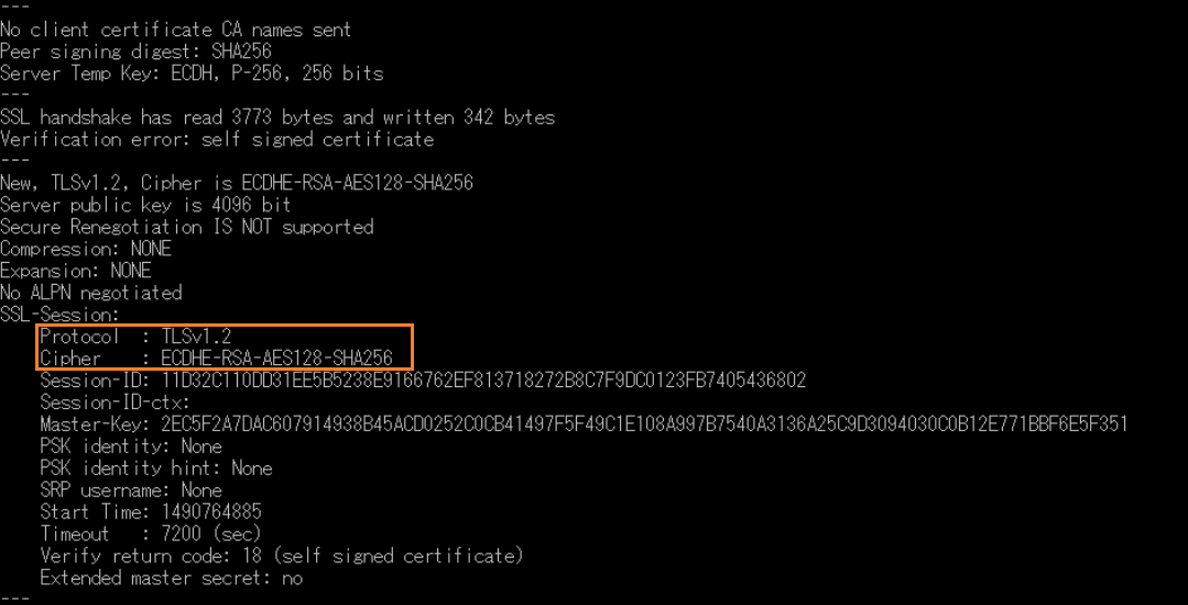 暗号化方式を(TLS1.2-ECDHE-RSA-AES-128-SHA256)に指定し、クライアントからOpenSSLで接続し指定の暗号化方式で接続されていることを確認します。