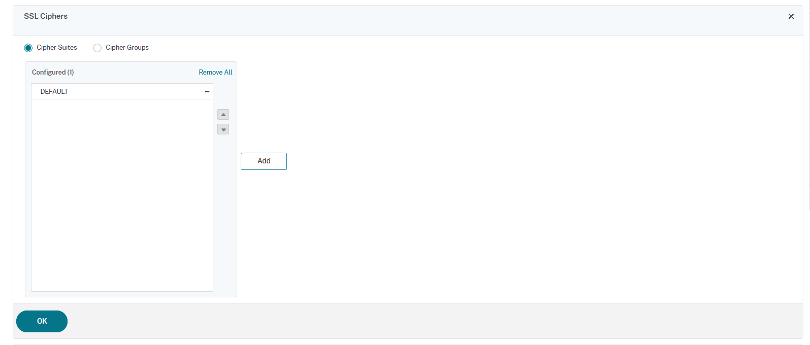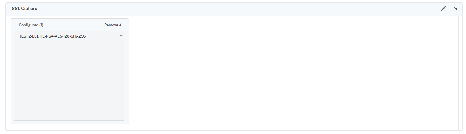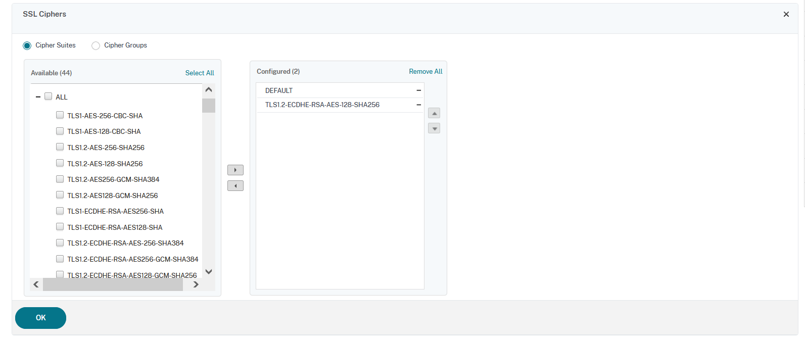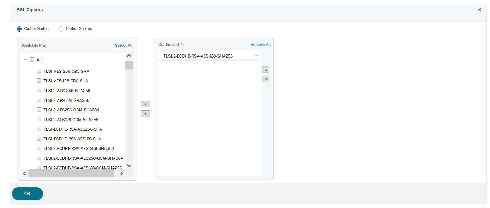 利用可能一覧画面が表示されるので、「ALL」の「TLS1.2-ECDHE-RSA-AES-128-SHA256」を選択し、右三角をクリックし対象の「Cipher Suite」を「Configured」に移動させます。