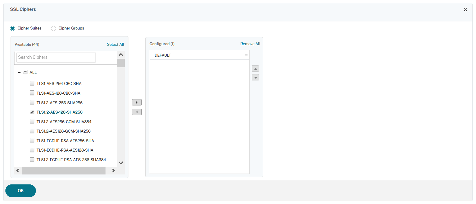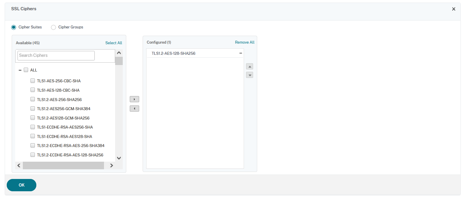 利用可能一覧画面が表示されるので、「ALL」の「TLS1.2-AES-128-SHA256」を選択し、右三角をクリックし対象の「Cipher Suite」を「Configured」に移動させます。