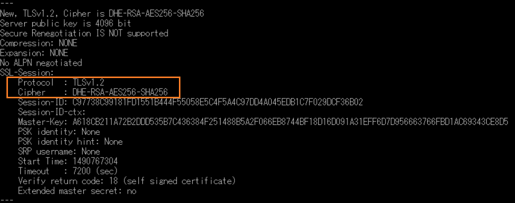 暗号化方式を(TLS1.2-DHE-RSA-AES-256-SHA256)に指定し、クライアントからOpenSSLで接続し指定の暗号化方式で接続されていることを確認します。