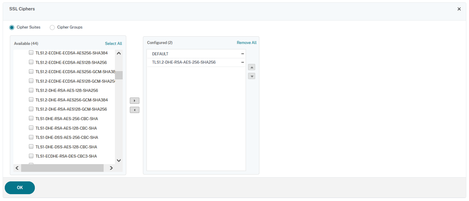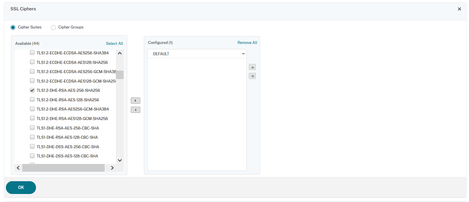 利用可能一覧画面が表示されるので、「ALL」の「TLS1.2-DHE-RSA-AES-256-SHA256」を選択し、右三角をクリックし対象の「Cipher Suite」を「Configured」に移動させます。