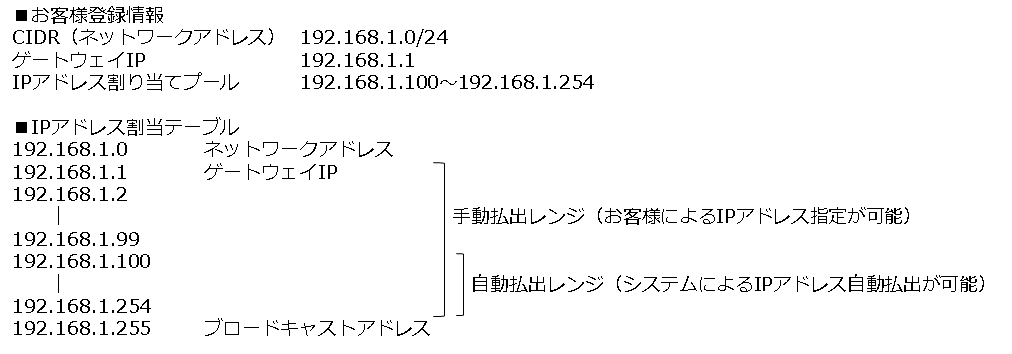例:ネットワークアドレスが192.168.0.0/24、ゲートウェイIPを指定しない場合、IPアドレス割り当てプールは192.168.0.2-192.168.0.254。