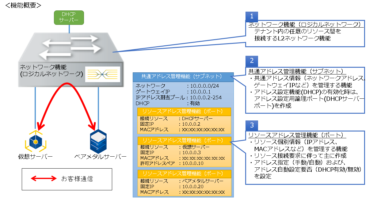 ロジカルネットワークに接続するリソースの個別設定(IPアドレス、MACアドレスなど)を管理する機能を提供します。
