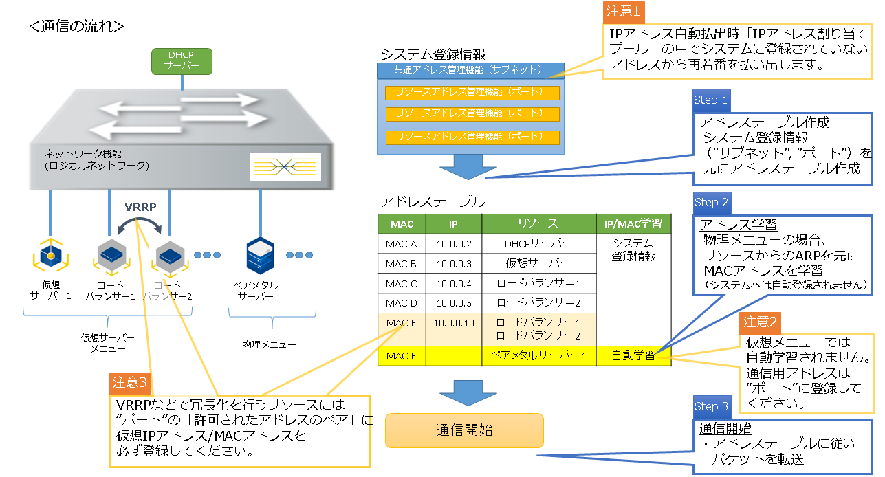 ロジカルネットワーク接続時に指定したIPアドレス以外の同一ネットワークアドレス内IPアドレスを利用して通信を行いたい場合、「リソースアドレス管理機能(ポート)」に必ずIPアドレスを登録してください。仮想メニューではIPアドレスが自動学習されないため、未学習ユニキャスト通信となり、通信出来なくなる場合があります。