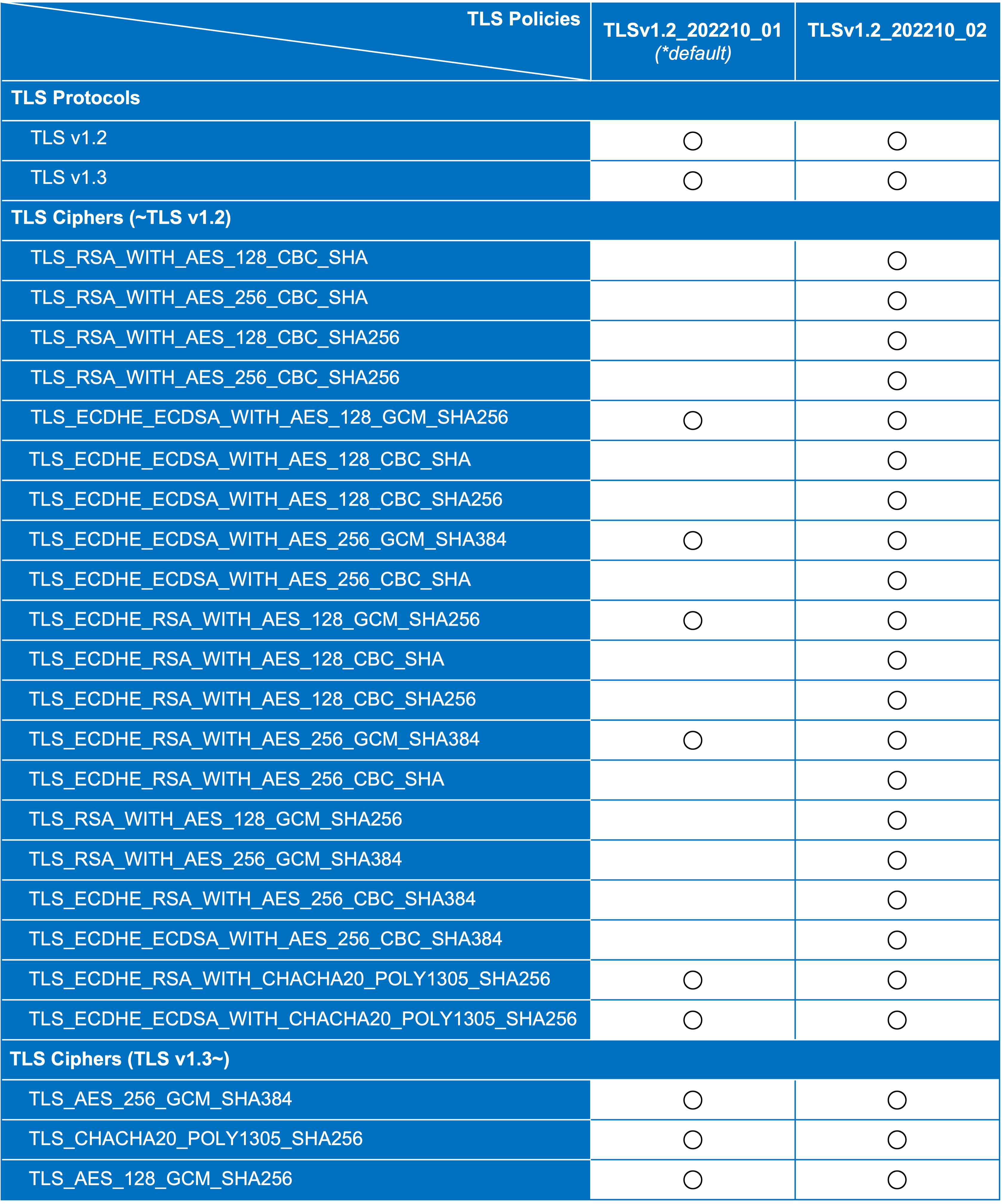 Managed Load Balancerで選択可能なTLS Policiesにおいて対応しているTLS ProtocolsおよびTLS Ciphersは下記表のとおりです。