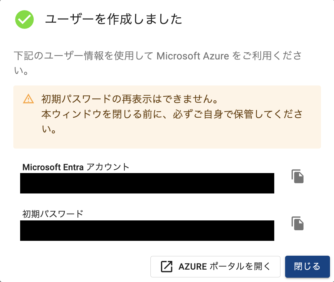 申込が完了すると、作成したMicrosoft Entraアカウントの情報が表示されます。