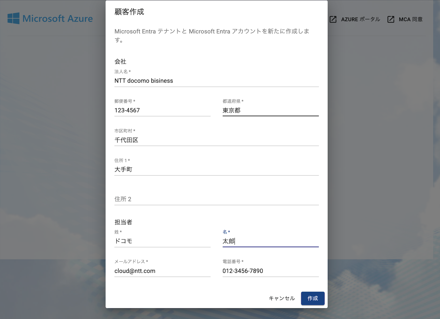 入力された情報は、Microsoft Azureの開通に必要なお客さま情報として登録されます。
