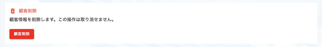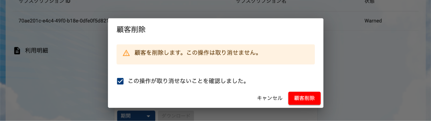 顧客削除画面が表示されますので、注意事項を確認しいただき、「この操作が取り消せないことを確認しました。」にチェックします。