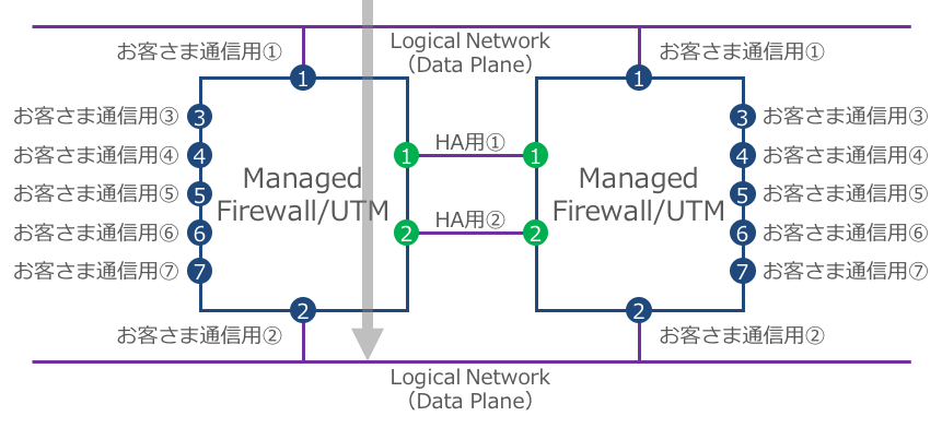 お客さま通信を処理するロジカルネットワークは、シングル構成の条件と同じ2つ以上ですが、プラスしてHA構成では、2つのデバイス同士を結ぶHA用のロジカルネットワークが2つ必要です。
