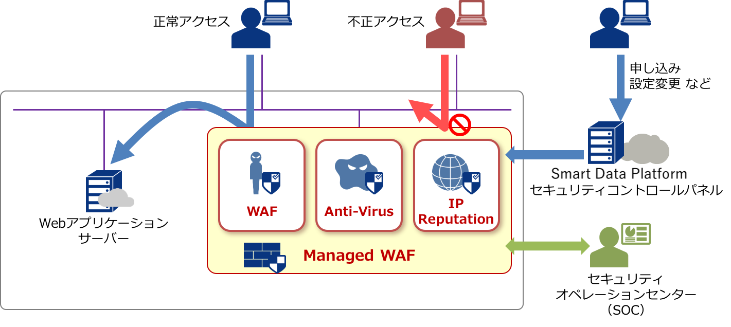 Webアプリケーションサーバーに対する攻撃検知/防御、ウイルス感染からの防御機能、脅威の発生源情報(脅威として特定できている情報)による検知機能 |