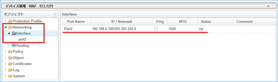 [ネットワーク管理]の[WAF Port Management]で設定したポートの情報を表示します。Pingリクエストへの応答を設定できます。