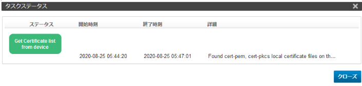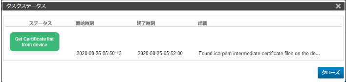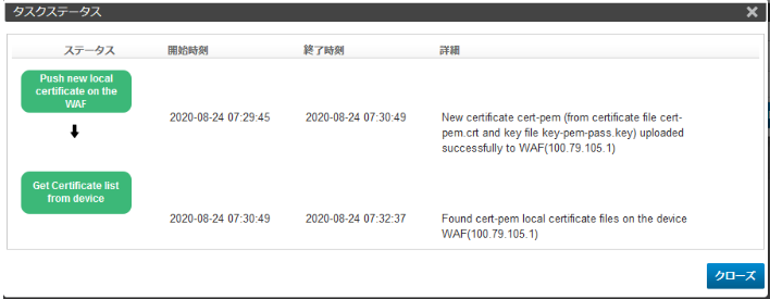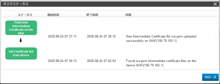 [ステータス]から進捗状況を確認できます。すべてのタスクが「緑色」になれば正常終了です。[クローズ]で閉じてください