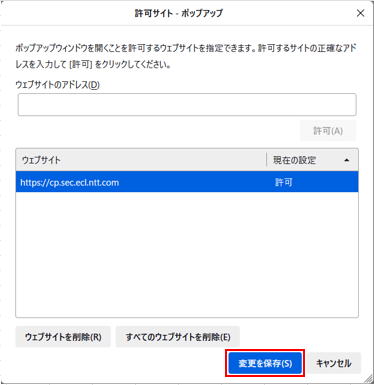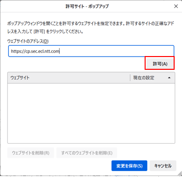 - 「許可サイト - ポップアップ」画面の「ウェブサイトのアドレス」に下記アドレスを入力し、「許可」をクリックします。● ウェブサイトのアドレス:https://cp-jp.sec.ecl.ntt.com