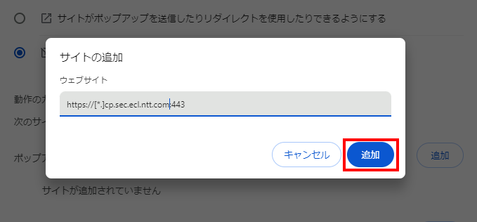 - 「サイトの追加」画面に、下記を入力します。● サイト:https://[*.]cp-jp.sec.ecl.ntt.com:443入力後、「追加」をクリックします。