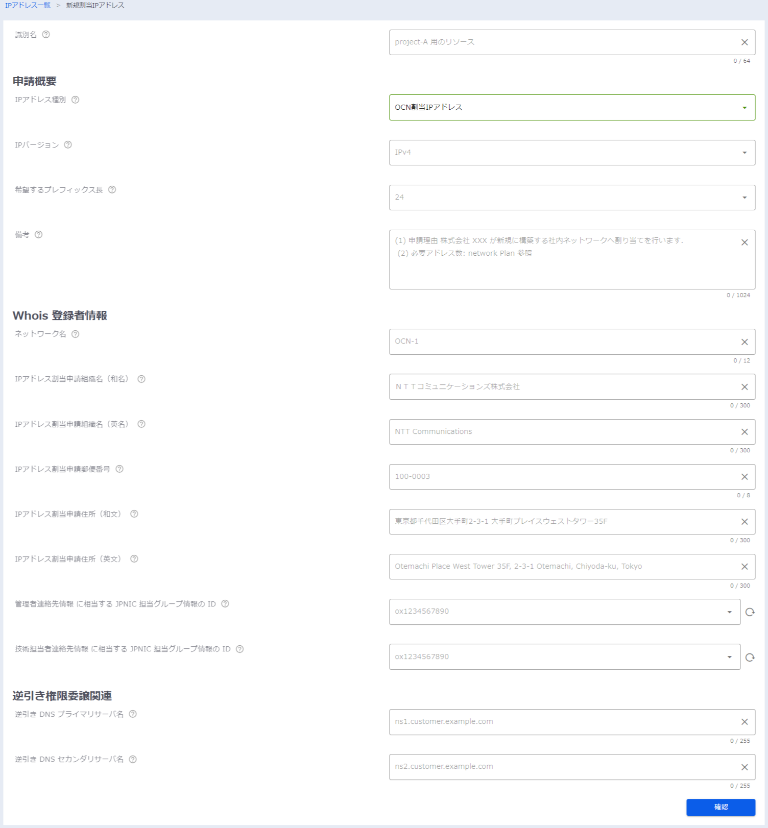 IPv4の場合/24未満、IPv6の場合/48を割当てる場合のお客様の逆引き権威DNSサーバ名を指定(OCN側から当該サーバに権限委譲を行います) |