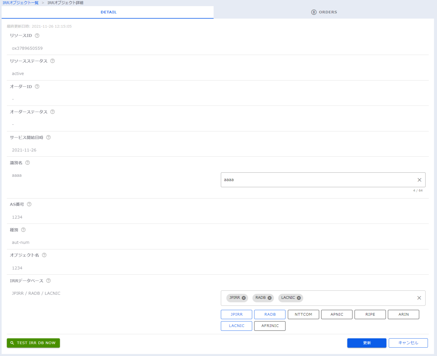 ・登録している「AS番号」、「IRRオブジェクト種別」「IRRオブジェクト名」は編集では変更できません。