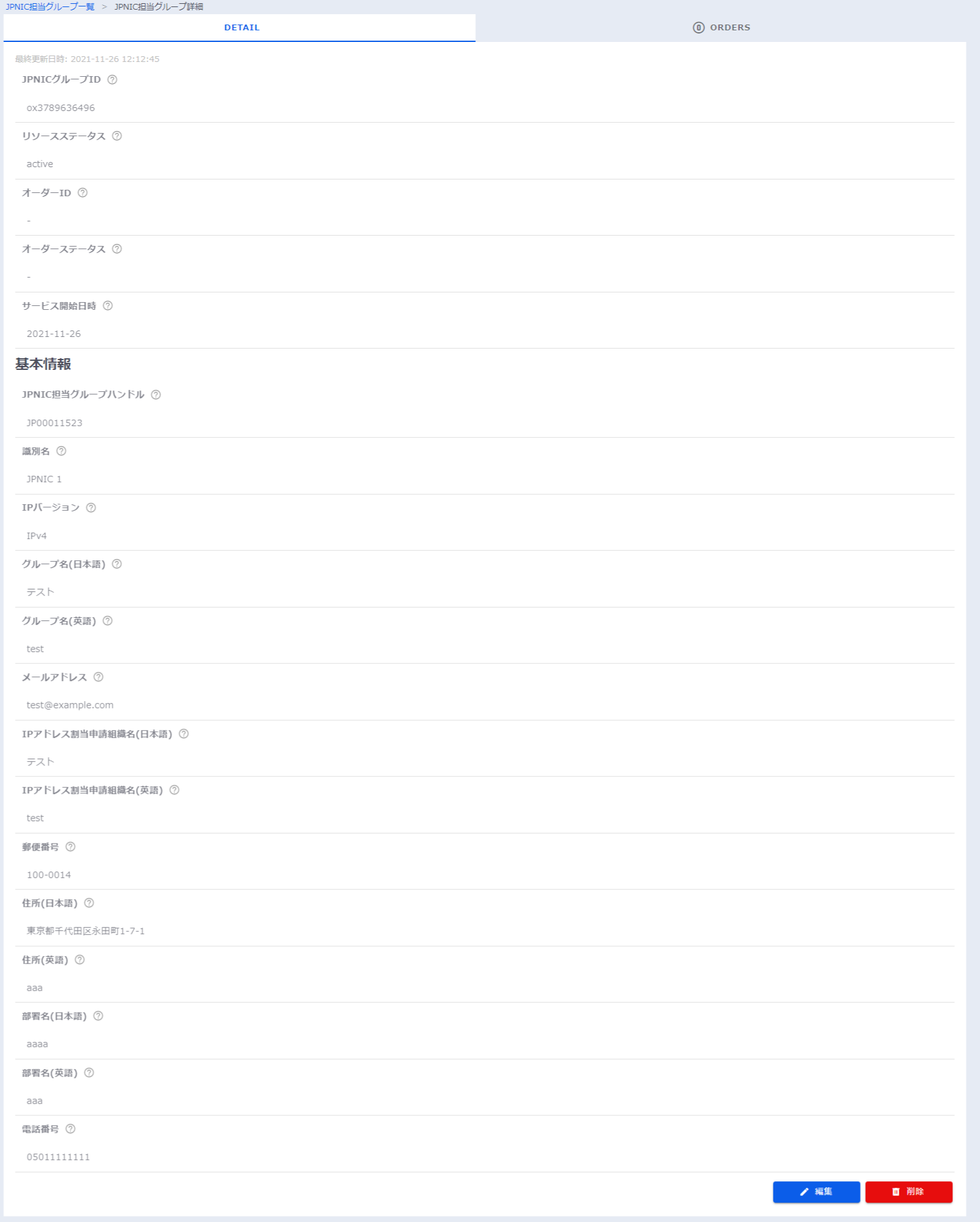 JPNIC担当グループハンドルリソースの詳細。 [該当リソースIDを押下] すると、リソースの詳細情報が表示されます。