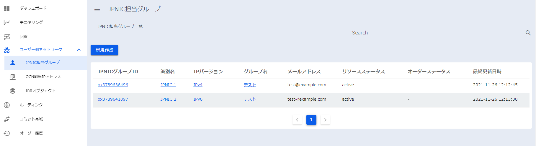 JPNIC担当グループハンドルリソースの一覧画面が表示されます。