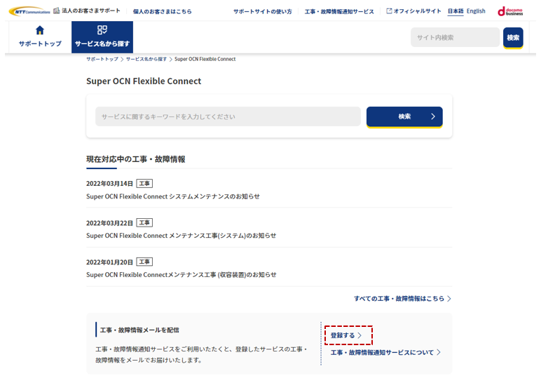 Super OCN Flexible Connectの工事・故障情報の掲載は http://support.ntt.com/s-ocn-fc/ になります。