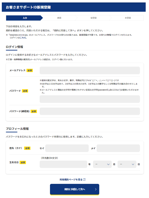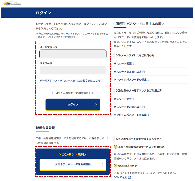 - メール配信・登録いただいたメールアドレス宛に、工事・故障情報メールを配信します。・メールの配信先と必要な情報をご登録ください。1.お客さまサポートIDを取得します。※ご登録無料。簡単な項目を登録するだけで取得できます。