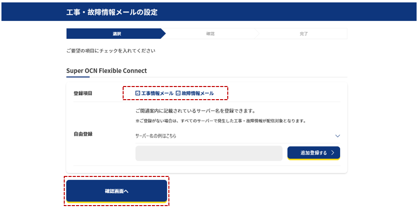 3.次に、「工事・故障情報通知サービス」の「法人のお客さまサービスを追加する」をクリックし、サービス一覧を表示します。 4.サービス一覧からメールの配信を希望するサービスを探し、工事・故障情報メールを配信欄から「登録する」をクリックして登録します。