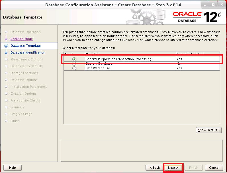 [Database Template] ウィンドウで、 [General Purpose or Transaction Processing] を選択します。