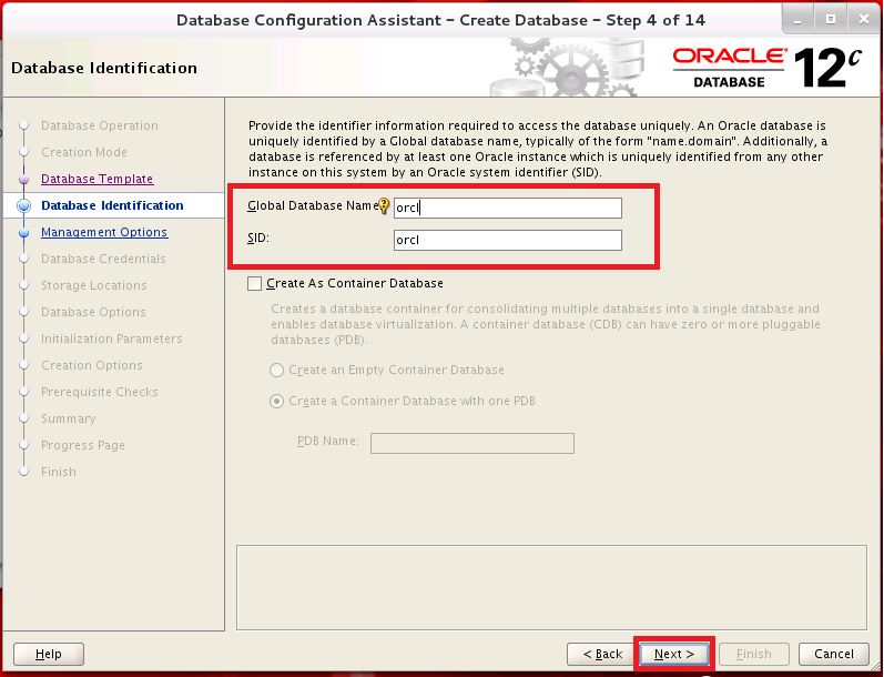[Database Identification] ウィンドウで、以下の値を選択します。