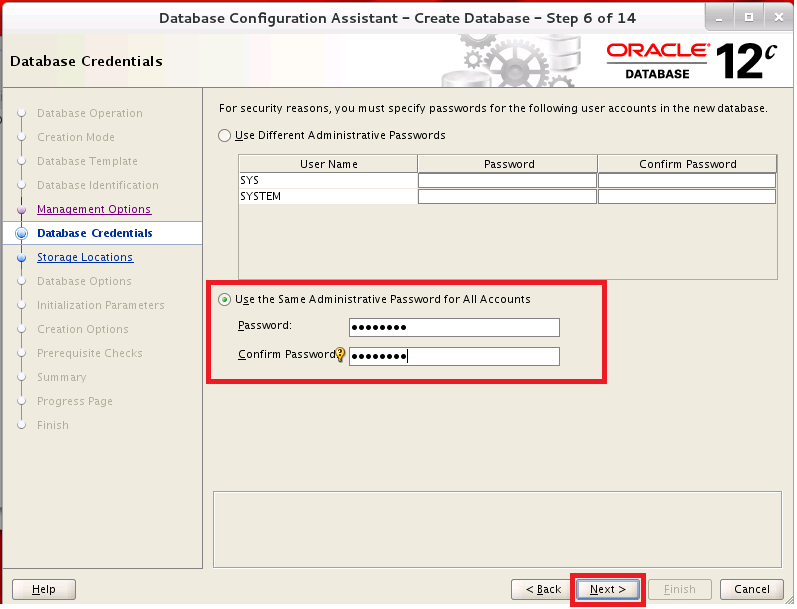[Database Credentials] ウィンドウで、以下の値を選択します。