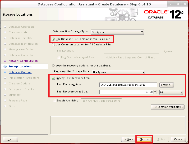[Storage Locations] ウィンドウで、以下の値を選択します。