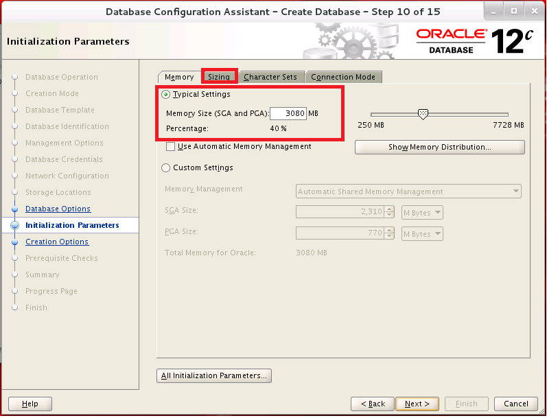 [Initialization Parameters - Sizing] ウィンドウで、以下の値を選択します。