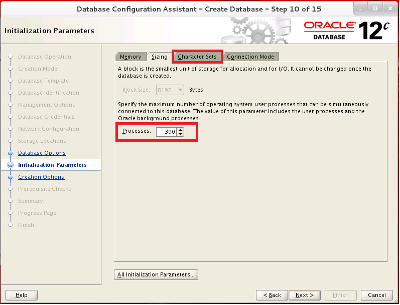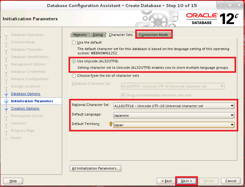 [Initialization Parameters - Character Sets] ウィンドウで、以下の値を選択します。