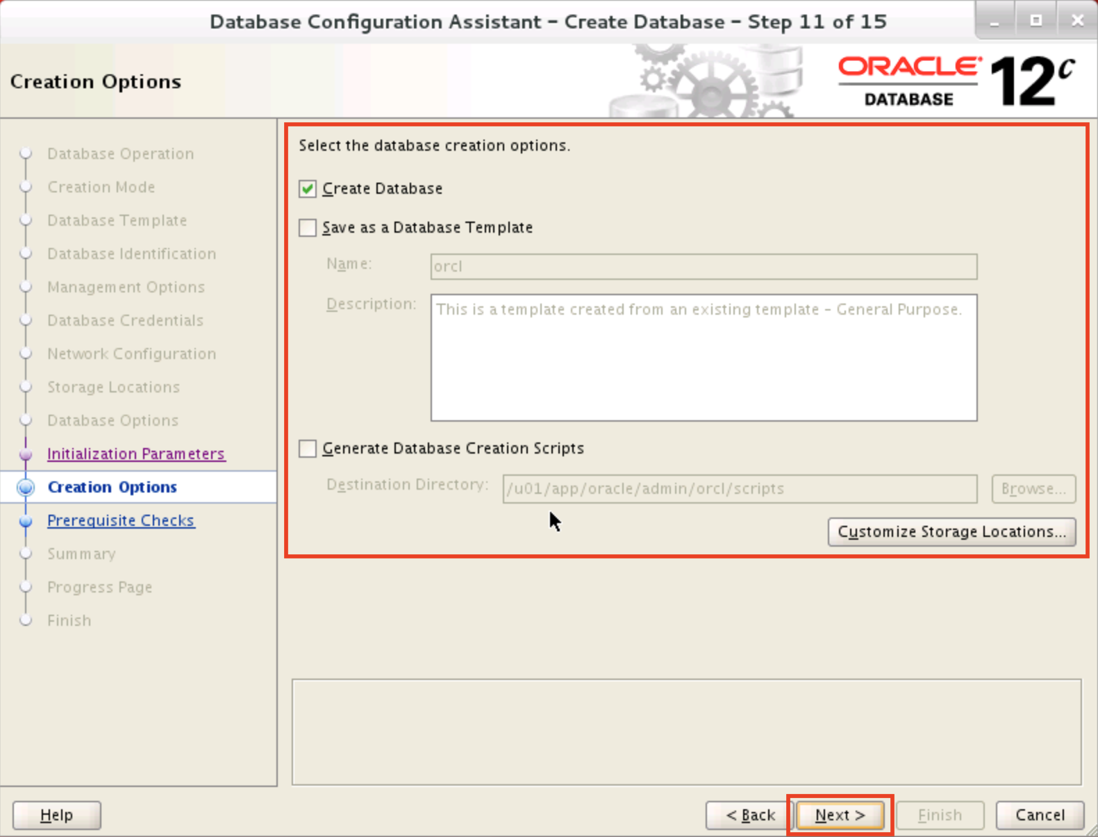 [Creation Options] ウィンドウで、以下の値を選択します。