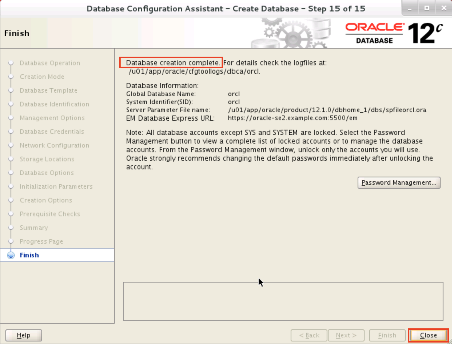 [Finish] ウィンドウで、 [Database creation complete.] を確認し、 [Close] を選択します。