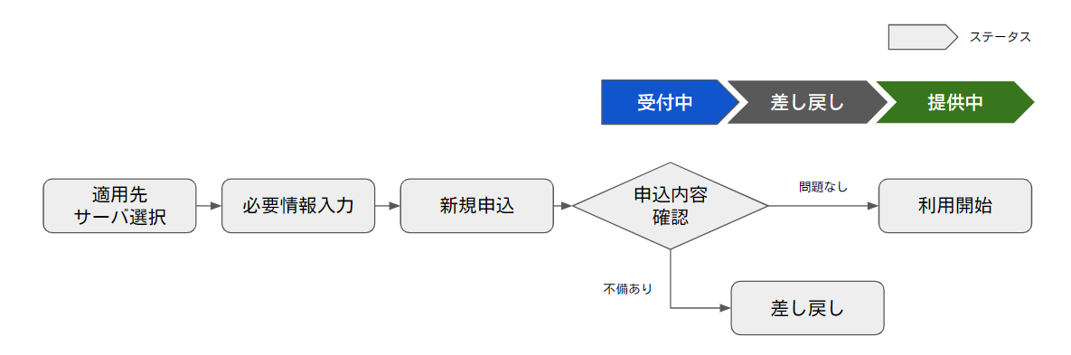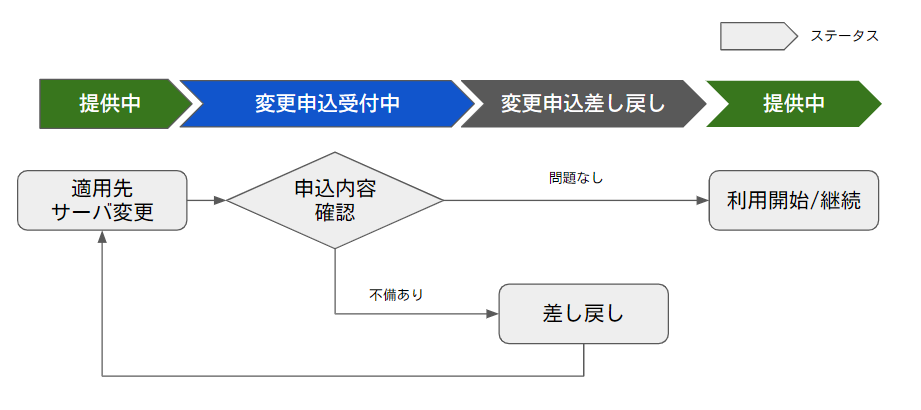 当社にて、お申し込み頂いた内容を確認(「申込内容確認」)し、問題なければ変更が反映されます。問題があれば、差し戻しを行い、「適用先サーバー変更」メニューから再度適用先サーバーの変更を実施いただきます。